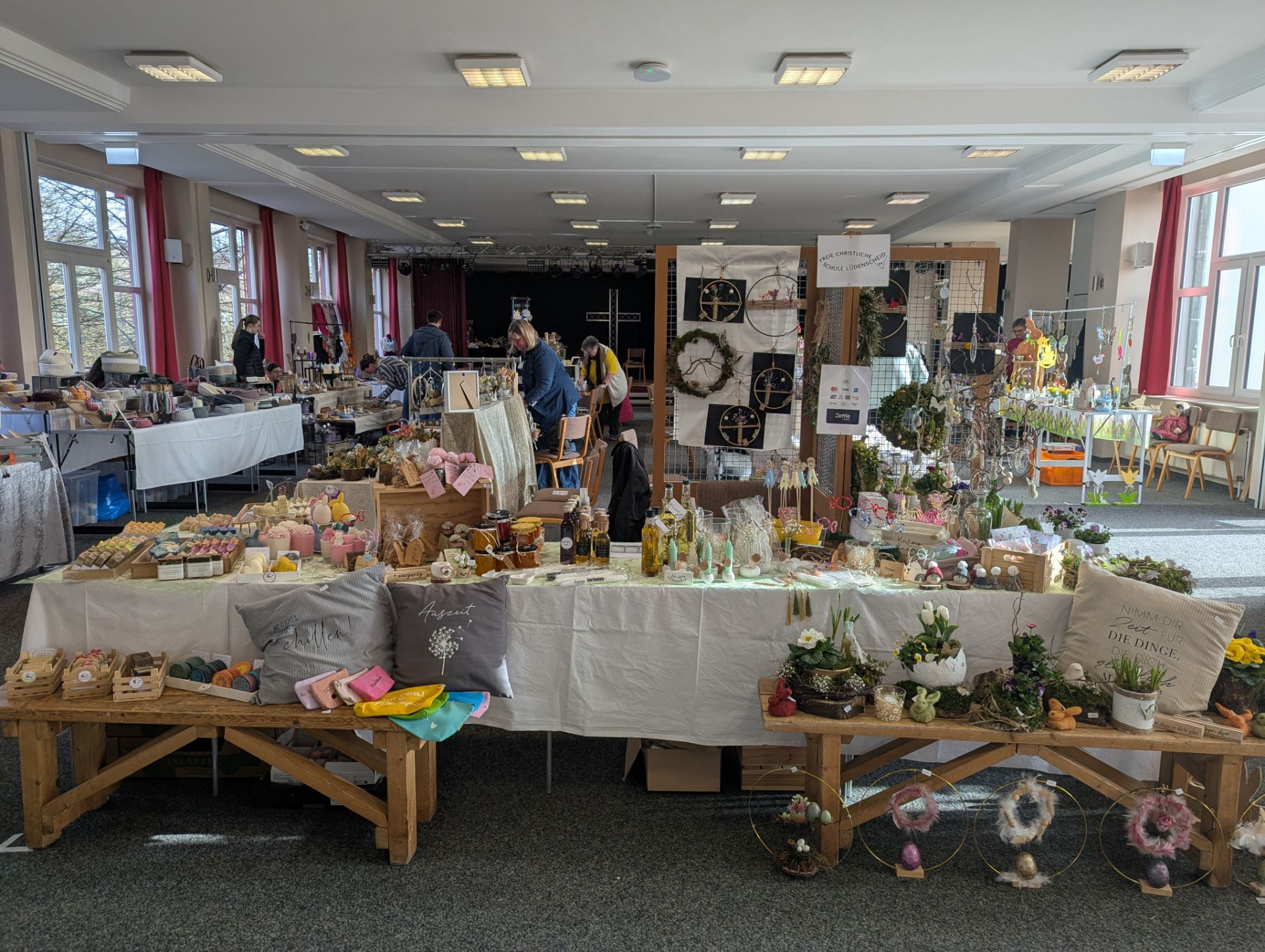 Auch in diesem Jahr war der Frühlingsmarkt des FCSL-Kreativkreises ein voller Erfolg. An zahlreichen Ständen konnten die Besucher selbsthergestellte Deko-Artikel, Blumengestecke, Seifen, Kerzen, Kissen, … und vieles mehr bewundern und selbstverständlich auch erwerben. Das tolle Angebot an selbst gebackenen, leckeren Kuchen lud zusätzlich zum Verweilen ein. Insgesamt brachte der Markt fast 3000 Euro für die Schule ein.